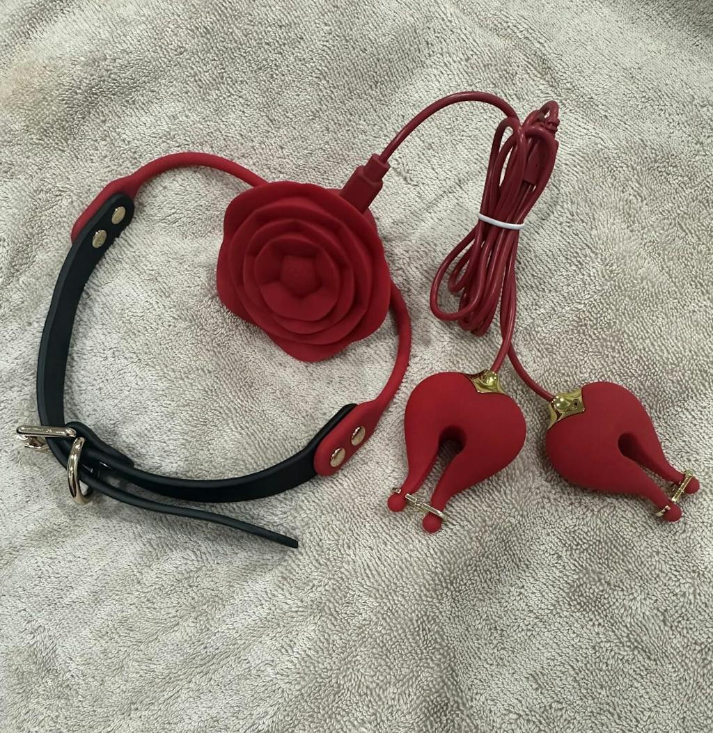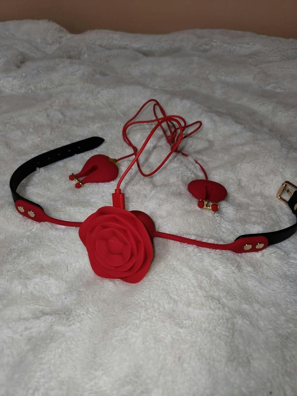 【Elegant Nipple & Collar Stimulator Set】Delight in the unique blend of elegance and excitement with our multifunctional nipple vibrator. Featuring a rose-shaped mouth gag linked by a chic black leather strap, this piece combines romantic design with bold sensuality. The heart-shaped nipple clamps, tailored for women and couples, are equipped with serrated interiors for a firm hold and thrilling vibrations.